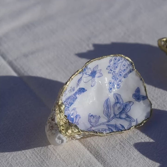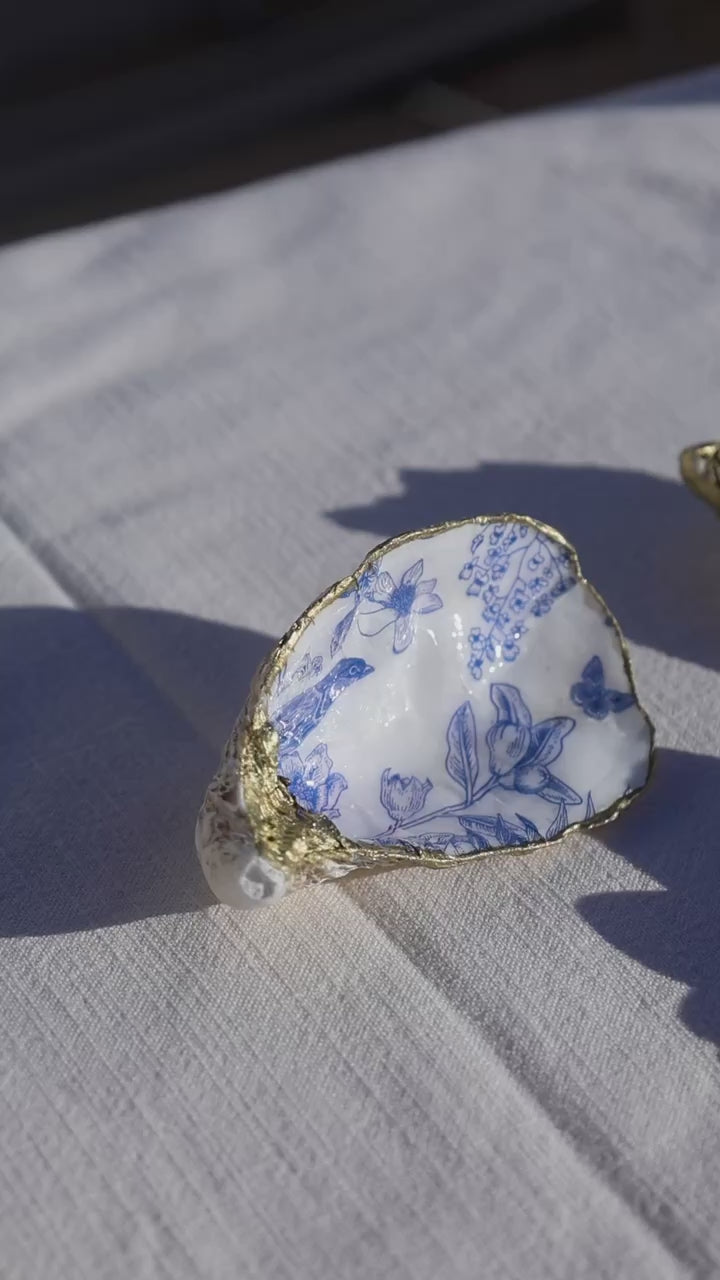 An exquisite fusion of nature and functionality, this real oyster shell is transformed into a decorative masterpiece. Hand-coated in clear epoxy for a glass-like finish and adorned with delicate blue botanical illustrations, the shell is trimmed in gold for a touch of refined elegance.